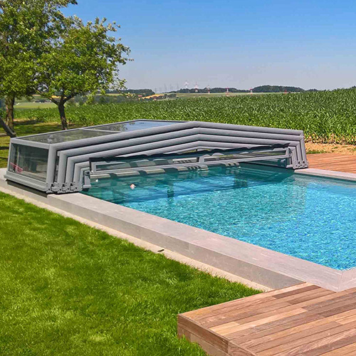 Wir sind Spezialist für schienenlose Schwimmbadüberdachungen, Poolüberdachungen, Poolhallen, Whirlpools und Swim-Spas.