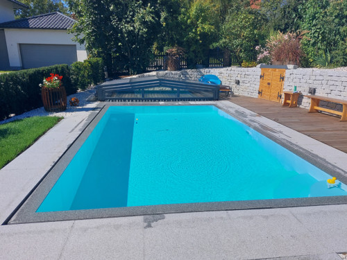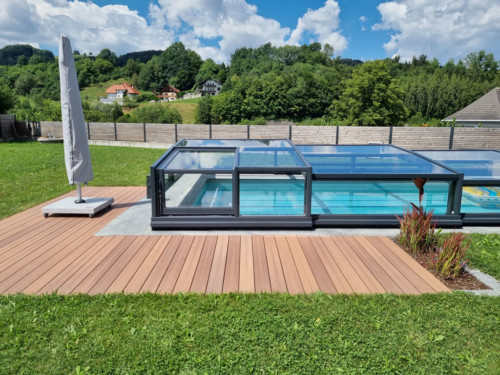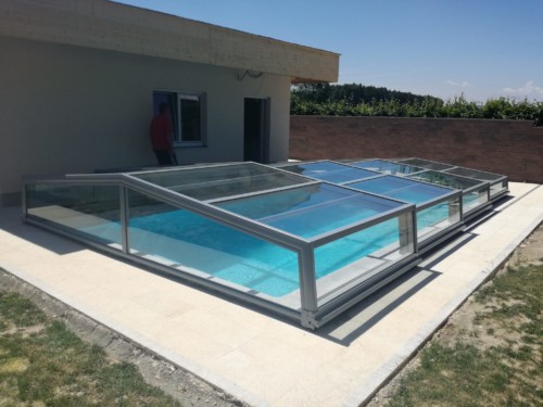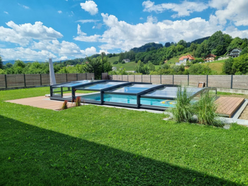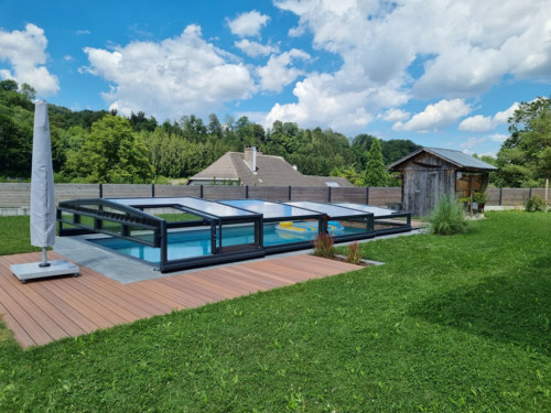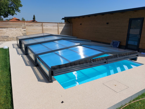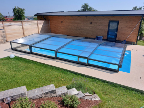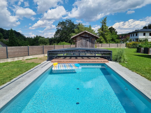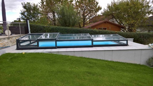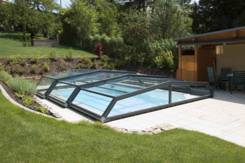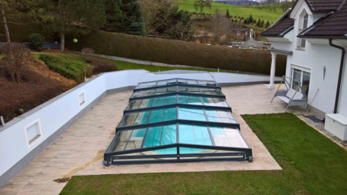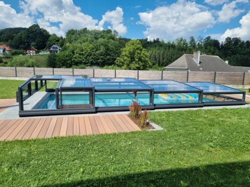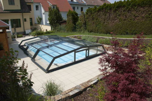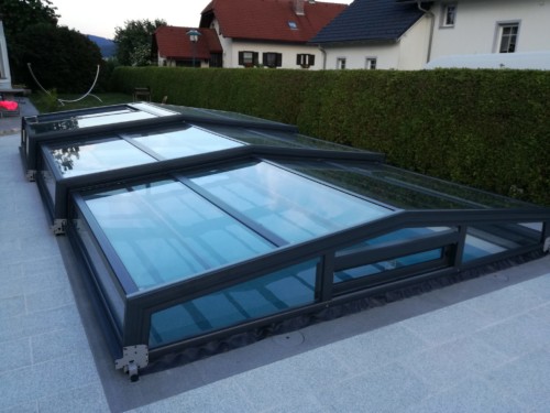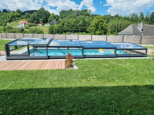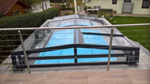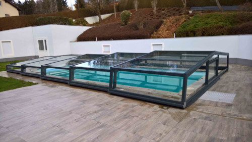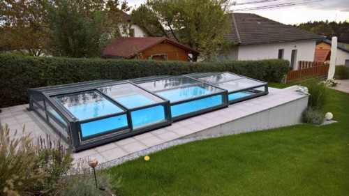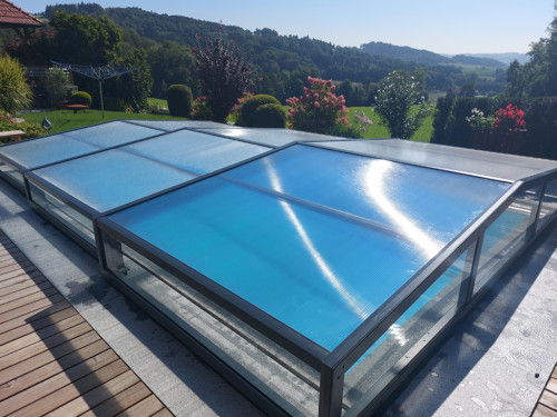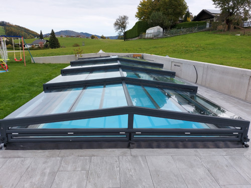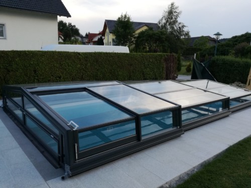 Belüftungsmöglichkeiten können in vielen Varianten gewählt werden und auch Schiebetüren, Schiebefenster und Zugangsmöglichkeiten werden jedem Pool individuell angepasst. In der Regel, sind unsere Niedrigüberdachungen so konstruiert, dass man das Pool zu 100 % uneingeschränkt benutzen kann, ohne die Überdachung jedes mal verschieben zu müssen. Somit is es kein Problem wenn es regnet, oder schon dunkel ist — schwimmen zu gehen, denn in der Überdachung ist es warm und geschützt.