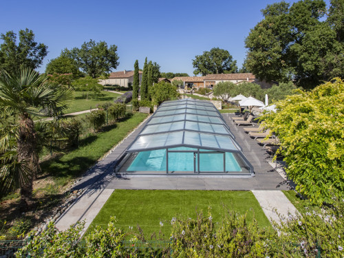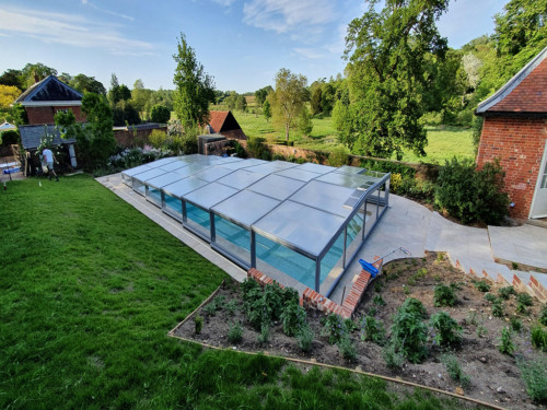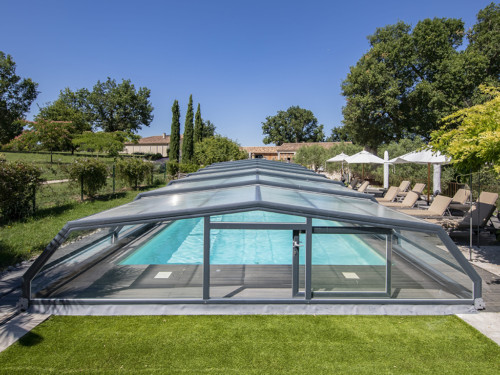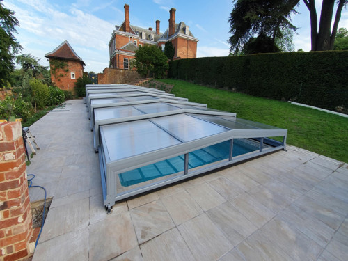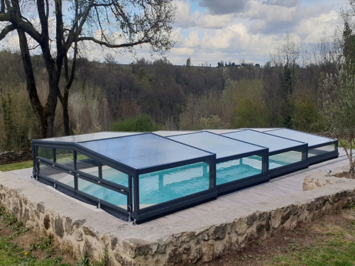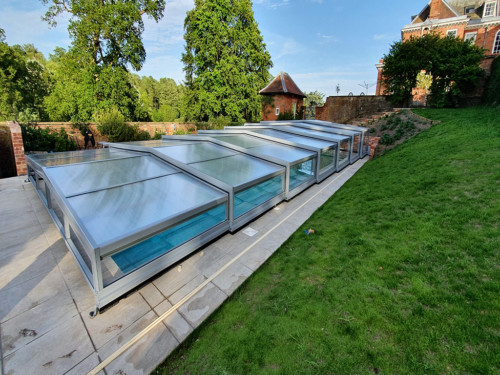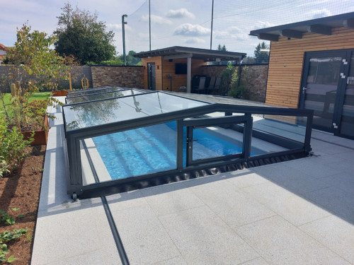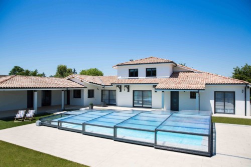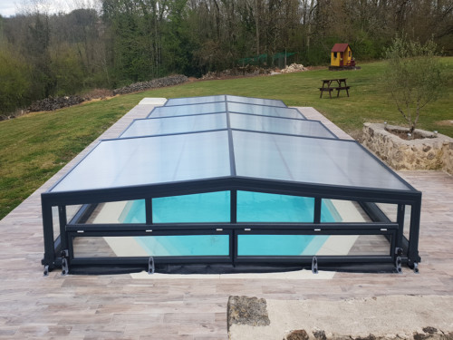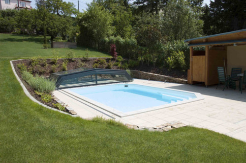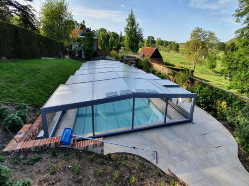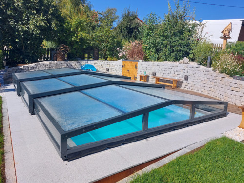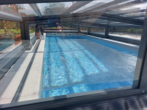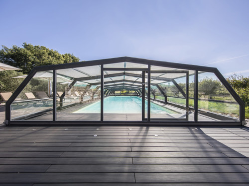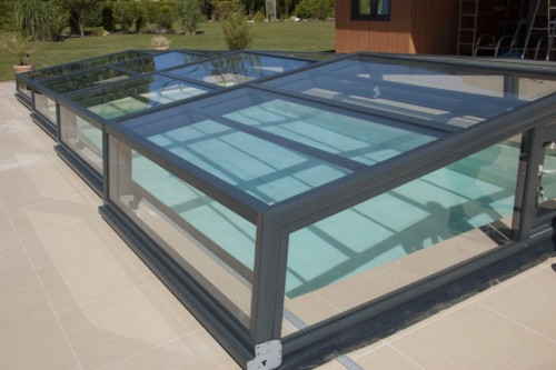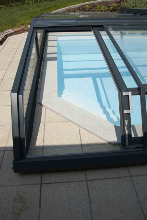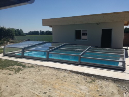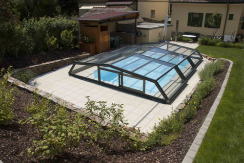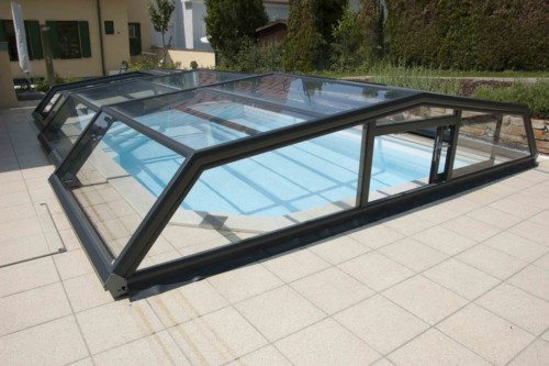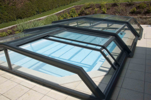 Die Komfortüberdachung par Excellence! Ohne Abschrägung der Seitenteile wird der Innenraum bei diesem Modell optimal genützt. Kompromiss zwischen Hochausführung und einfacher Schutzabdeckung (Höhe von 0,40 m 1,20 m) ermöglichen eine komplette Raumausnützung des Pools und der Beckenumrandung, bei gewissen Modellen sitzend und sogar stehend.