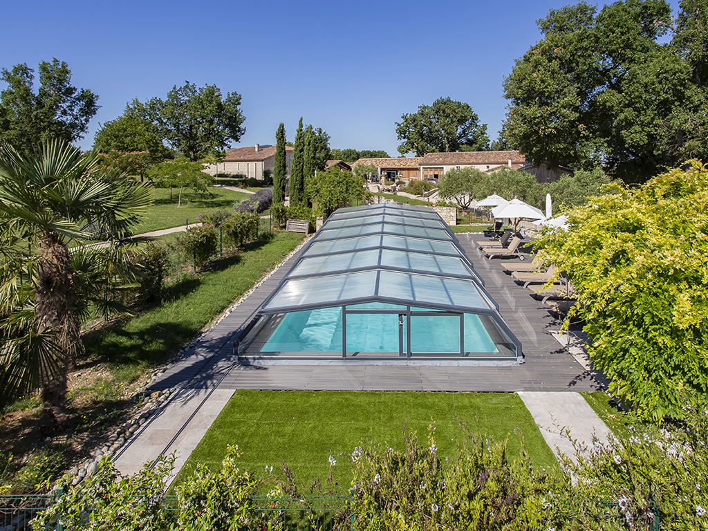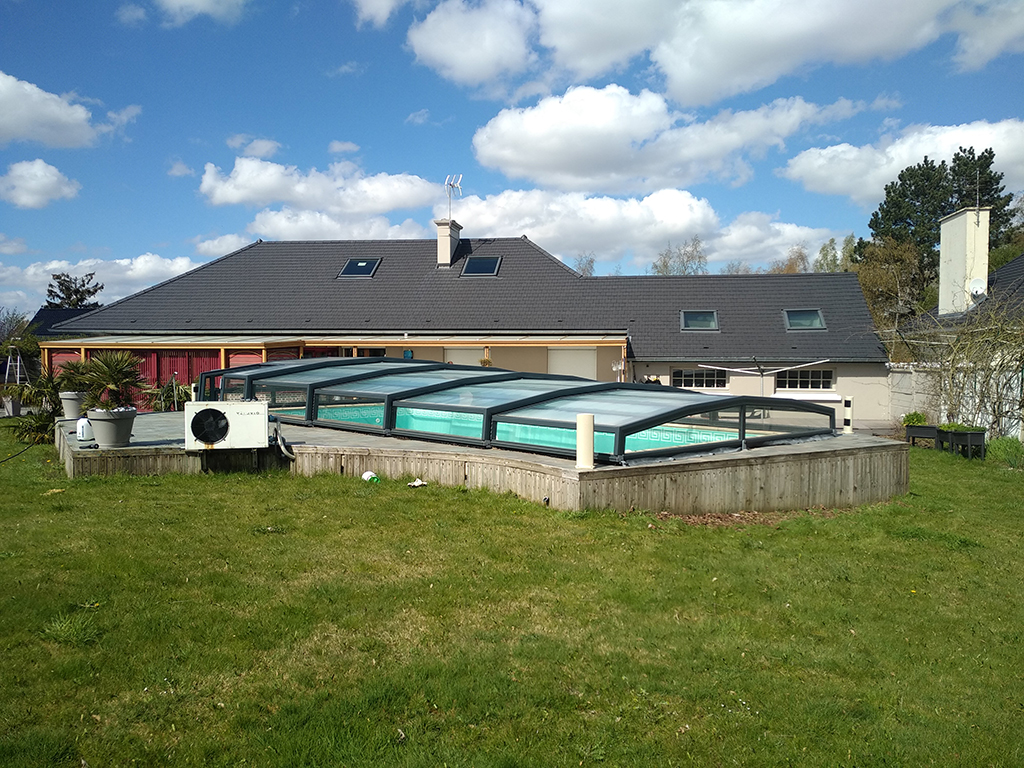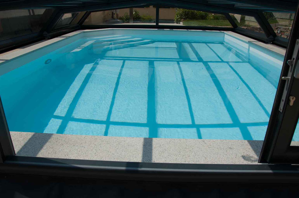 Die Kom­fort­über­da­chung par Excel­lence! Ohne Abschrä­gung der Sei­ten­tei­le wird der Innen­raum bei die­sem Modell opti­mal genützt. Kom­pro­miss zwi­schen Hoch­aus­füh­rung und ein­fa­cher Schutz­ab­de­ckung (Höhe von 0,40 m 1,20 m) ermög­li­chen eine kom­plet­te Raum­aus­nüt­zung des Pools und der Becken­um­ran­dung, bei gewis­sen Model­len sit­zend und sogar stehend.