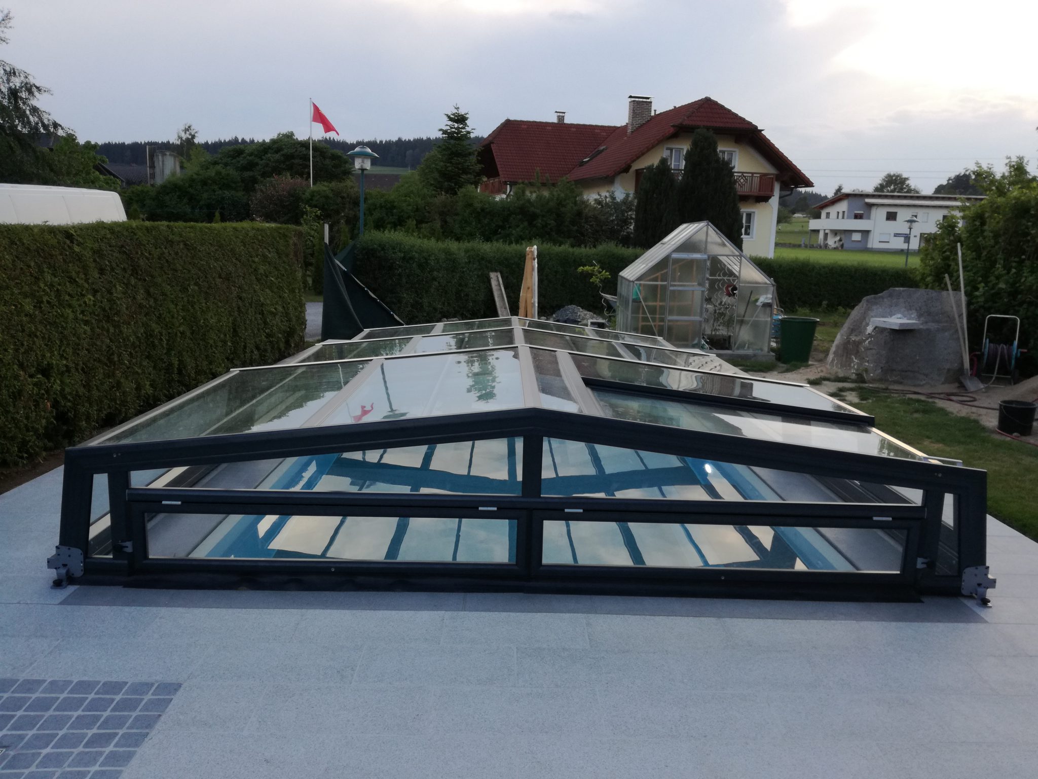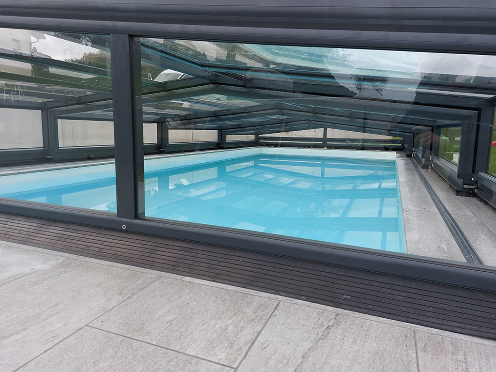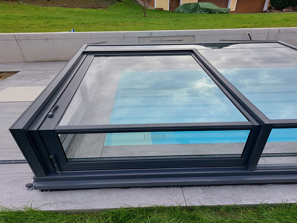 Belüf­tungs­mög­lich­kei­ten kön­nen in vie­len Vari­an­ten gewählt wer­den und auch Schie­be­tü­ren, Schie­be­fens­ter und Zugangs­mög­lich­kei­ten wer­den jedem Pool indi­vi­du­ell ange­passt. In der Regel, sind unse­re Nied­rig­über­da­chun­gen so kon­stru­iert, dass man das Pool zu 100 % unein­ge­schränkt benut­zen kann, ohne die Über­da­chung jedes mal ver­schie­ben zu müs­sen. Somit is es kein Pro­blem wenn es reg­net, oder schon dun­kel ist — schwim­men zu gehen, denn in der Über­da­chung ist es warm und geschützt.